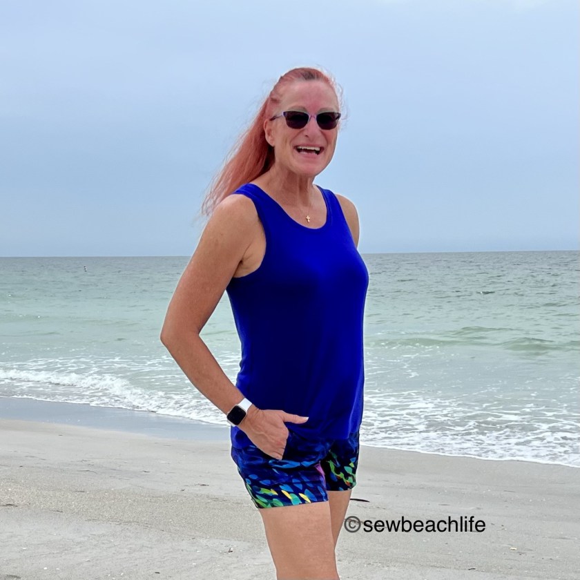 The slimmer cut blue tank is made of modal from Purple Seamstress Fabric. I’m wearing it with an as yet unreleased shorts pattern. Don’t you love getting a sneak peek at future patterns? π