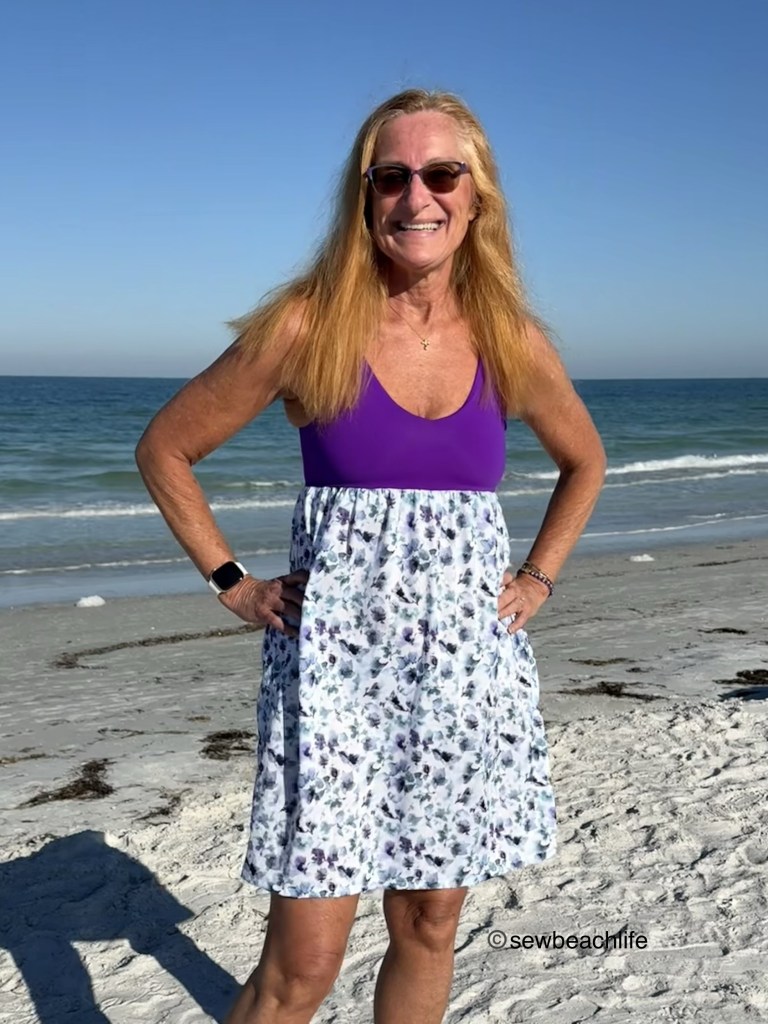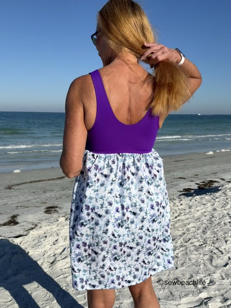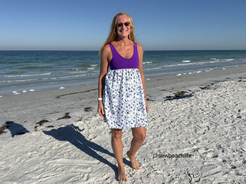 The purple nylon spandex swim for the Bobbi Brami dress was from the sadly defunct Phee Fabrics. The white floral/leaf print cotton voile was from the also defunct JoAnn Fabrics.