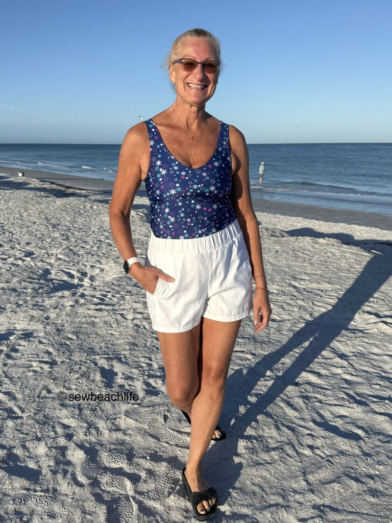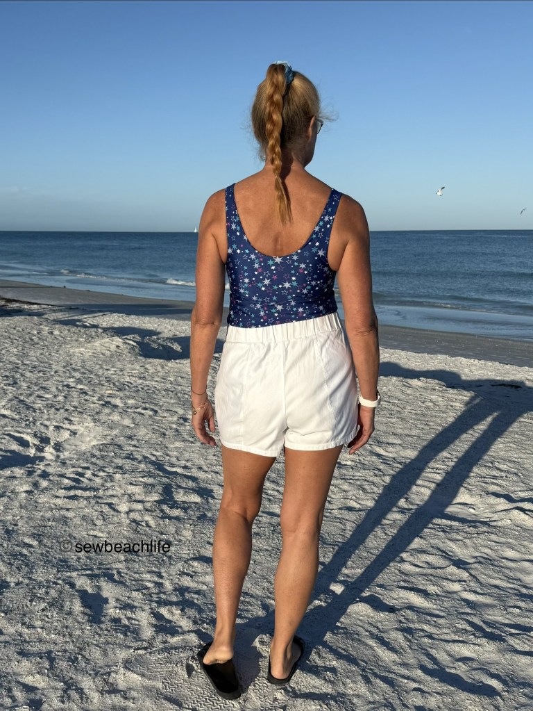 My first two makes were Bobbi Brami‘s. I love that they have a built-in bra, and that they are super comfortable. I’ve worn the blue star print Brami to step class with Moxi bike shorts. It also looks great with my white Windward Shorts. This is a great outfit for walking around, shopping, or running errands.