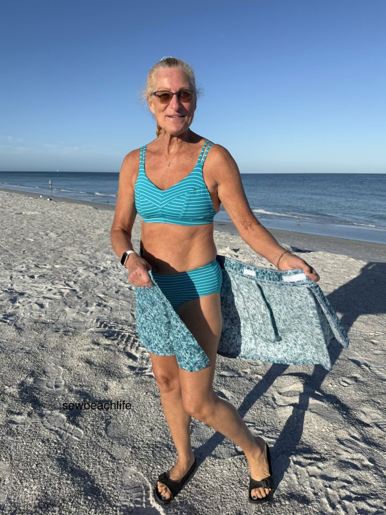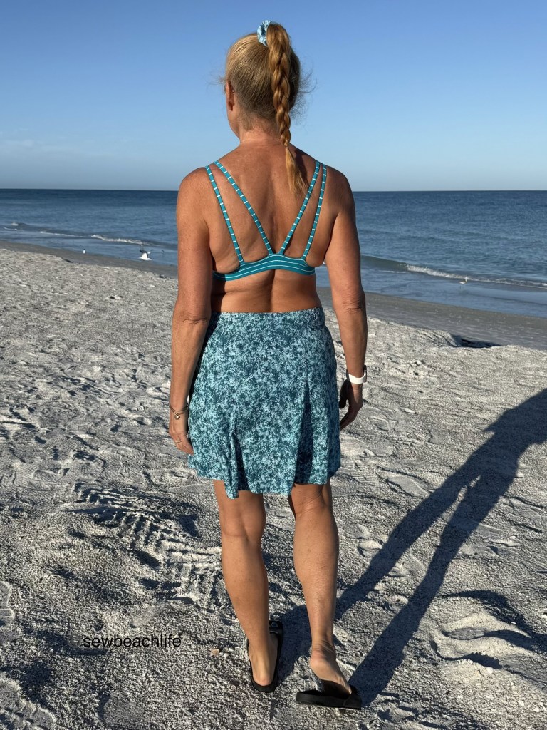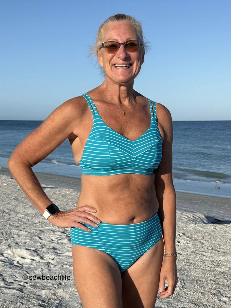 The third and fourth pieces are an Endurance Bra and Tangled Swim Bottom swimsuit. As mentioned in this post, I always hack the Endurance to not have a zipper. And for this make, I also shortened the band by 5/8″ at center front, up to 1-1/4″ at center back to give it a more “swimsuit” look.