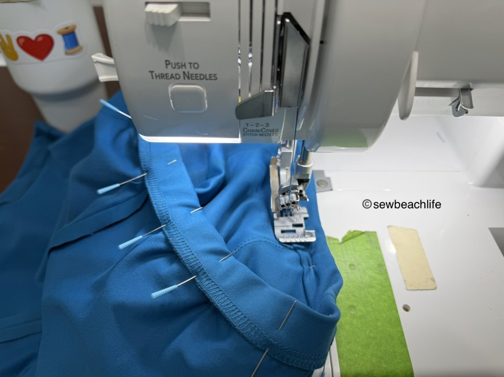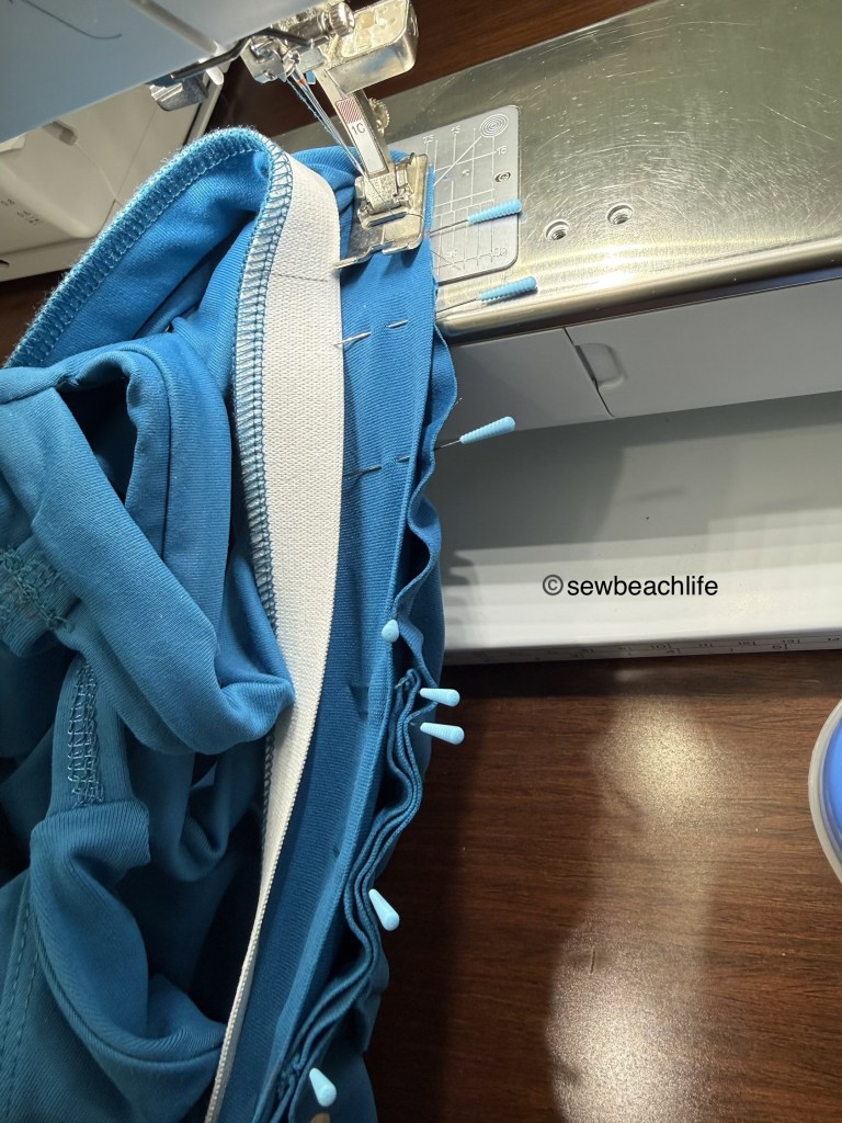 The next part seems tricky, but it’s really not. It’s more a matter of aligning and pinning. π To sew the band, bra, and bodice together, align the raw edges in this order: right side of band against wrong side of bra. Align the finished back edges of the bra back with the previously made tailor’s chalk marks. Align the center fronts, as well as the side seams and quarter points. Then align the right side of the bodice with the right side of the bra, matching the quarter points. The bra will be sandwiched between the band and bodice. Pin all around and baste all the layers together. Looking at the photo above see how there’s only two layers of fabric where I’m sewing? That’s the band and bodice at the infinity back opening. Near the bottom of the photo you can see the bra sandwiched in there. Having everything basted together will make it easier to serge the seam. You may want to use a hump jumper when you go from two layers of fabric to four.