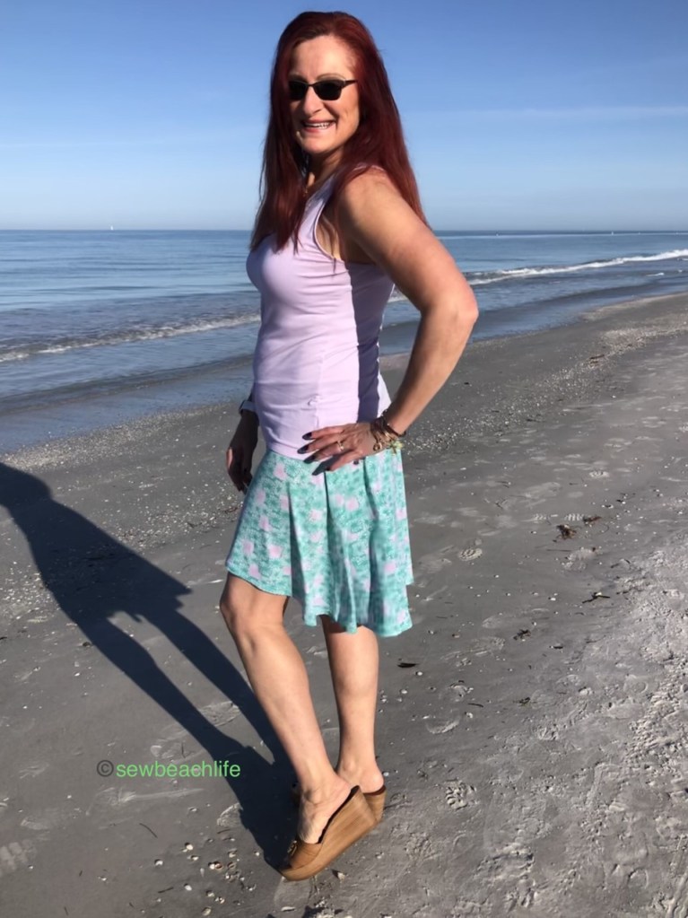 The purple ombre cotton print came from my local(ish) quilt and sewing machine shop in Tampa a couple of years ago. I used Sergin’ General from Superior Threads in periwinkle to serge and coverstitch it. I wore my purple skirt with a slightly hacked Endurance Sports Bra (made with Greenstyle fabric), which you can read more about here. I’ve also worn it with an Azure Tank, shared here.