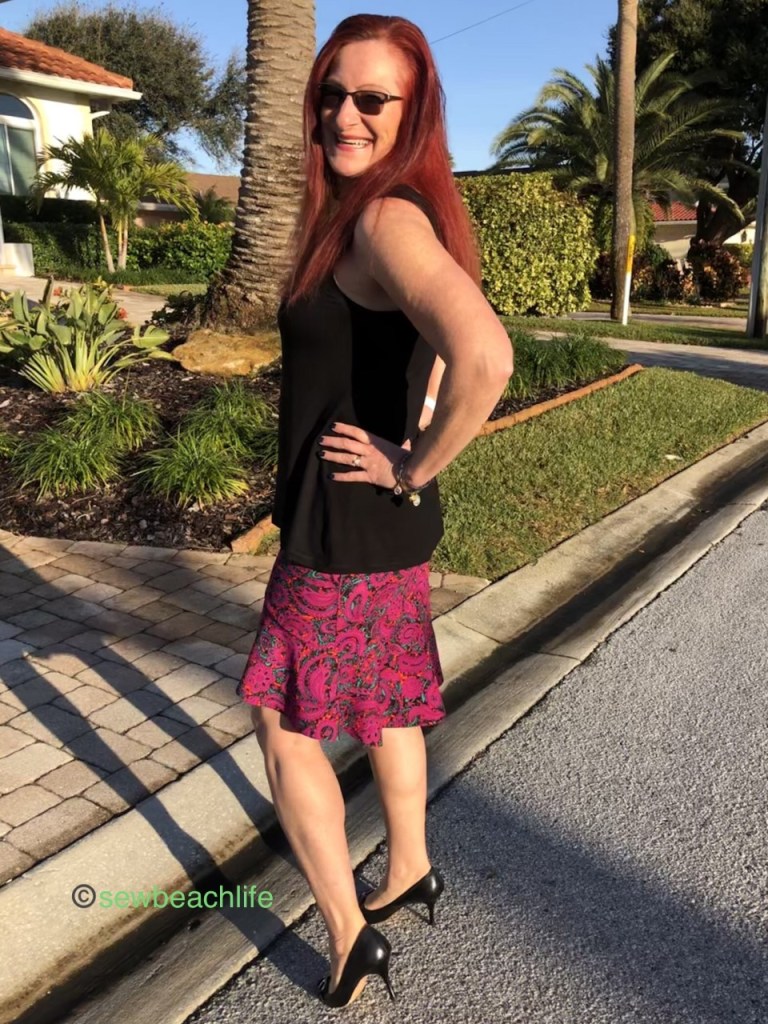 It’s a fun wrap skirt with godets in the back and a contoured waistband for a perfect fit. The pattern tutorial calls for Velcro closures, but you could use buttons or snaps if you prefer. I chose Velcro, and found Sleek & Thin sew on low profile fastener at Michael’s. It truly is sleek and thin, and is so soft that you could use it for children’s clothing. Even the “hook” side of this variety of hook and loop fastener isn’t scratchy at all. I was surprised and impressed at how different it is from the industrial version.